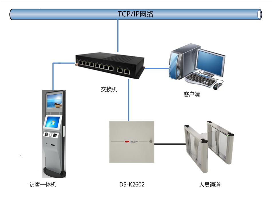人員出入口控制系統由感應IC卡、感應讀卡器、速通門設備、通道閘控制器、出入口管理軟件及工作站等組成。根據出入口通道管理需要,設計選用網絡型通道控制主機,通道控制器采用TCP/IP通訊方式進行與上層管理層通訊方式,支持聯機或脫機獨立運行。每個通道控制器可以控制1個通道,系統架構圖如下: