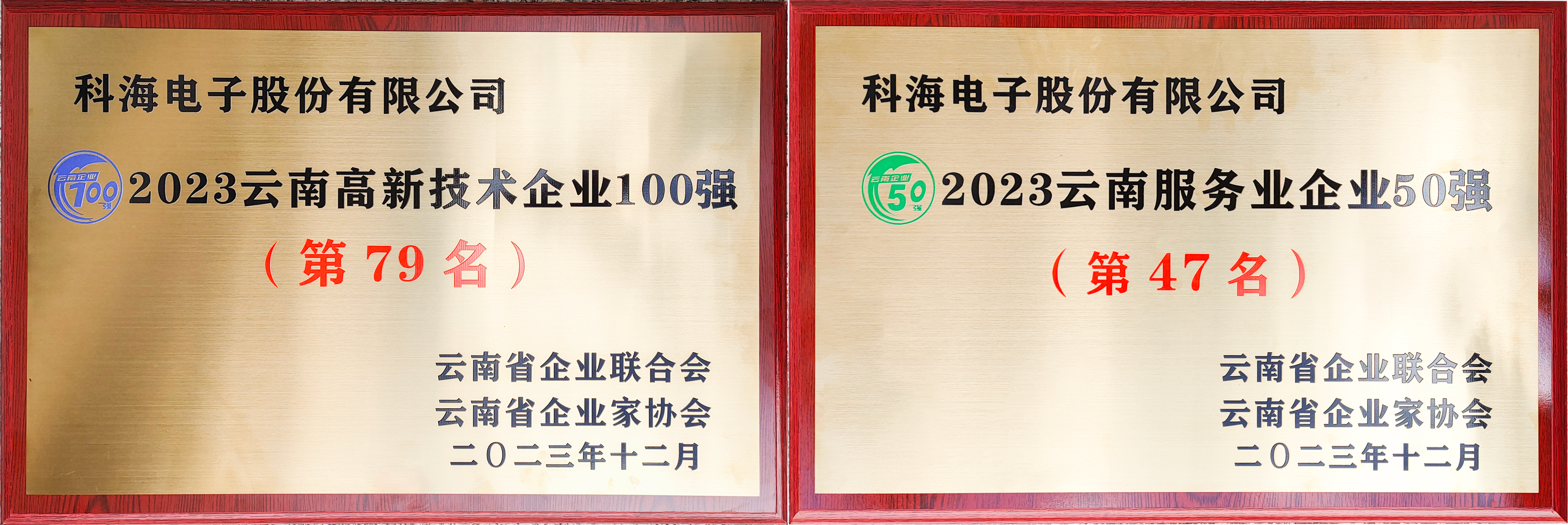 12月16日,由云南省企業(yè)聯(lián)合會、云南省企業(yè)家協(xié)會聯(lián)合舉辦的“2023云南企業(yè)100強發(fā)布會”在昆明市隆重舉行,會議對云南優(yōu)秀企業(yè)進行了榮譽表彰。科海電子榮登“2023云南高新技術企業(yè)100強”、“2023年云南服務業(yè)企業(yè)50強”榜單。